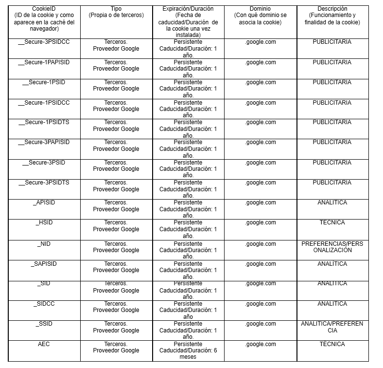 En la presente Política de Cookies encontrará la descripción y finalidad de cada una de las cookies utilizadas, así como su nombre, el servidor de envío, su caducidad e información de cómo verificar si existe transferencia internacional de datos.